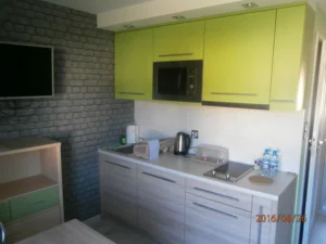 - Aneks kuchenny : lodówka, mikrofala , płyta ceramiczna, zlewozmywak , pochłaniacz świetlny z nawiewem, czajnik elektryczny, szafki. Pełne wyposażenie – sztućce, talerze miski, patelnia, kubki, deski, chlebak, płyn do mycia naczyń, literatki , ściereczki, podstawka z wikliny, kosz na śmieci, przyprawy, woda mineralna ręczniki papierowe.