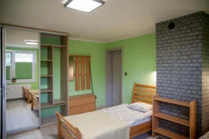 - Dwa łóżka jednoosobowe, szafa ubraniowa duża typu komandor z lustrami, komoda, ,regał, lustro, szafka na buty wieszaki, koce, lampki.
