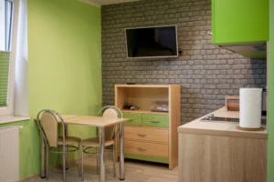 - Komplet sprzętu AGD (lodówka, kuchenka ceramiczna, mikrofalówka, czajnik bezprzewodowy, pochłaniacz z oświetleniem i wywiewem, naczynia, sztućce, zlewozmywak, kubki, garnki, patelnia, płyn do mycia naczyń, deski, chlebak, literatki, ściereczki itd.