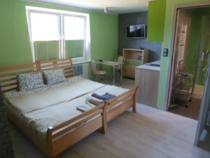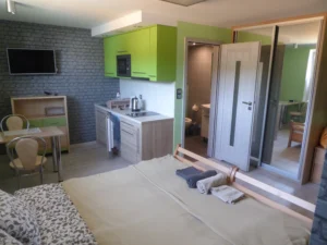 Obiekt całkowicie nowy składający się z dużego pokoju, łazienki, aneksu kuchennego i przedpokoju.