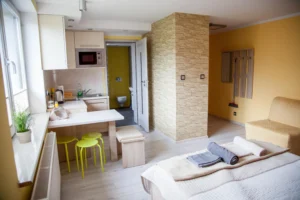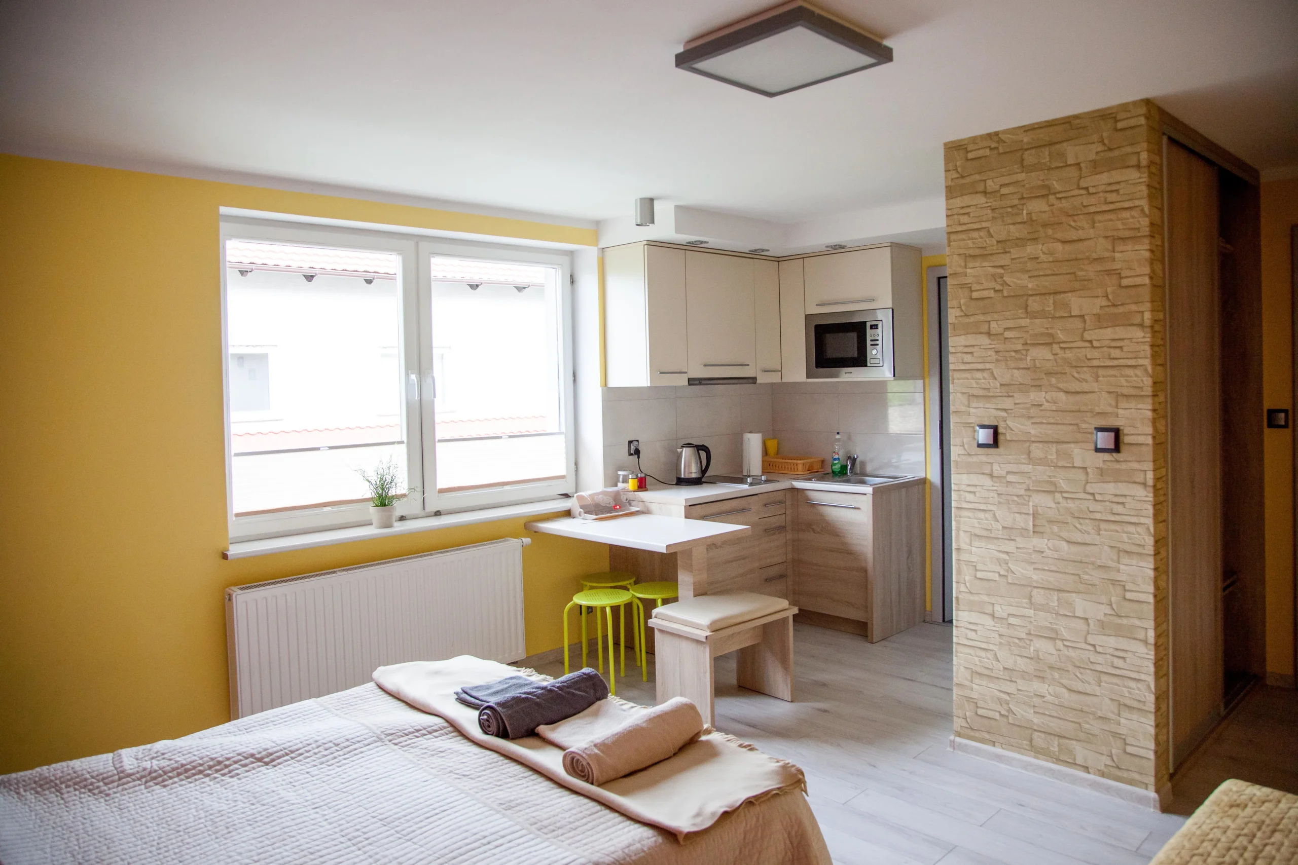 Obiekt całkowicie nowy składający się z dużego pokoju, łazienki, aneksu kuchennego i przedpokoju. Studio jest o podwyższonym standardzie z pełnym wyposażeniem.